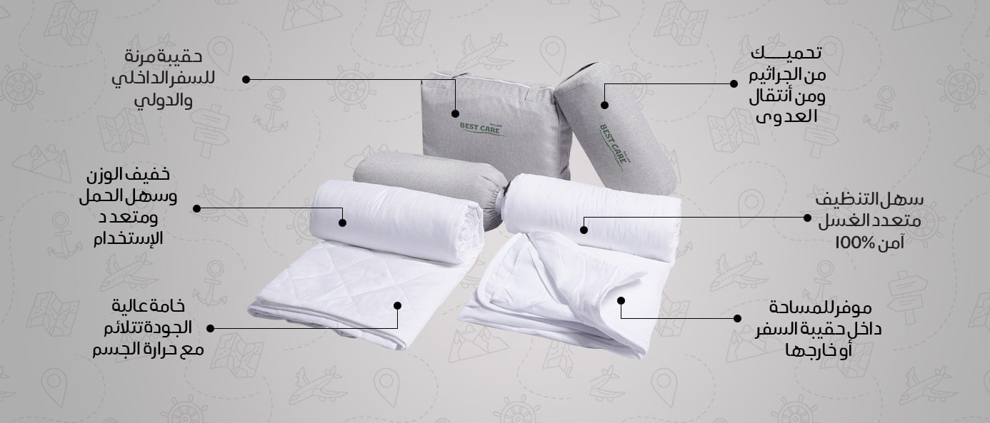 اجعل كل رحلة تجربة مريحة وآمنه مع مفرش السفر الآمن المتنقل من Best Care. هذا المنتج المميز مصمم خصيصًا ليمنحك الآمان الصحي والراحة اثناء سفرك وتنقلك بين الفنادق والشقق المخدومه . سافر بأمان